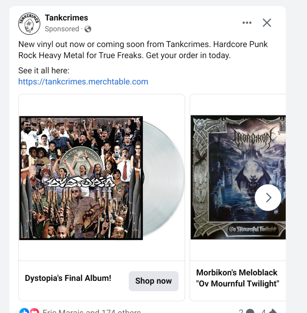 - A 1% lookalike audience of people who had previously bought from the label. A lookalike audience is essentially Meta building an audience that reflects the 1% of people in a given territory whose buying activity most closely emulates the people who the lookalike audience is based on. In other words – this got us a lot of punk people who would like Tankcrimes.